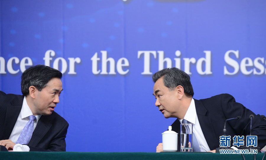 ??? 十二屆全國(guó)人大三次會(huì)議新聞中心于3月8日(星期日)10時(shí)在梅地亞中心多功能廳舉行記者會(huì),邀請(qǐng)外交部部長(zhǎng)王毅就中國(guó)的外交政策和對(duì)外關(guān)系相關(guān)問題回答中外記者提問。圖為外交部部長(zhǎng)王毅與記者會(huì)主持人交流。新華網(wǎng)/中國(guó)政府網(wǎng) 郭小天 攝