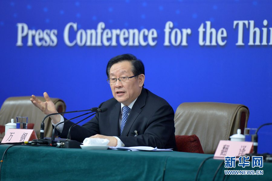 十二屆全國人大三次會議新聞中心于3月11日10時45分舉行記者會,邀請科技部部長萬鋼就科技改革與發展回答中外記者提問。圖為萬鋼回答記者提問。新華網/中國政府網 郭小天 攝