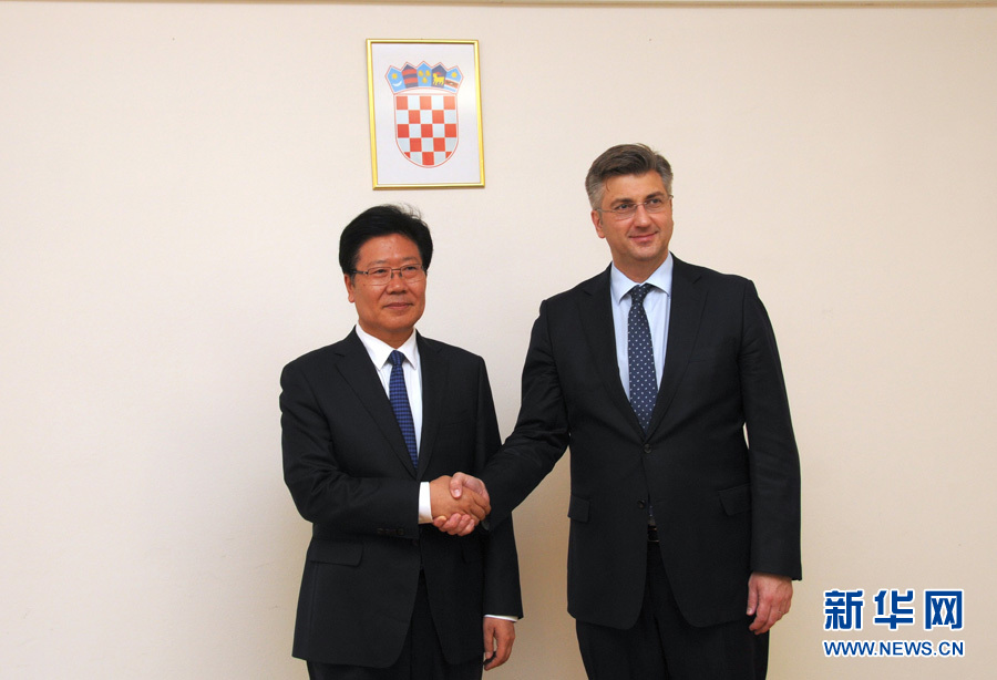 ??? 4月10日,克羅地亞民主共同體主席、政府總理普連科維奇(右)在薩格勒布會(huì)見中共中央政治局委員、中央黨的建設(shè)工作領(lǐng)導(dǎo)小組副組長張春賢。新華社記者薛群攝