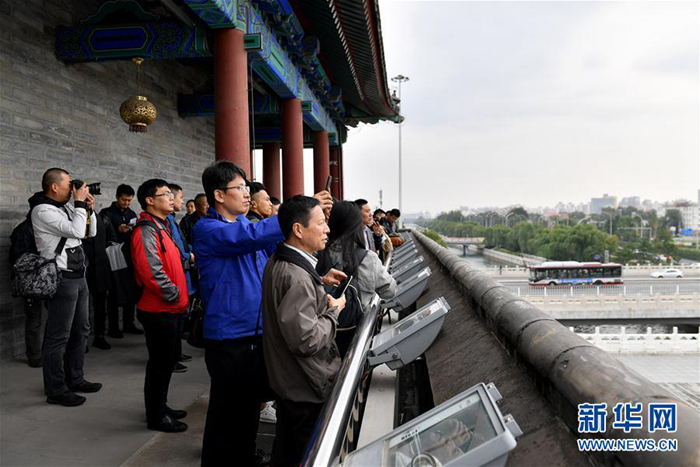 10月12日,記者團在北京永定門城樓上參觀。新華社記者 李鑫 攝