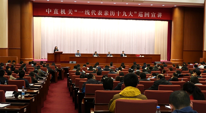 11月14日,中直機關(guān)“一線代表親歷十九大”巡回宣講首場報告會在北京全國政協(xié)機關(guān)會議樓舉行。新華網(wǎng) 聶晨靜 攝