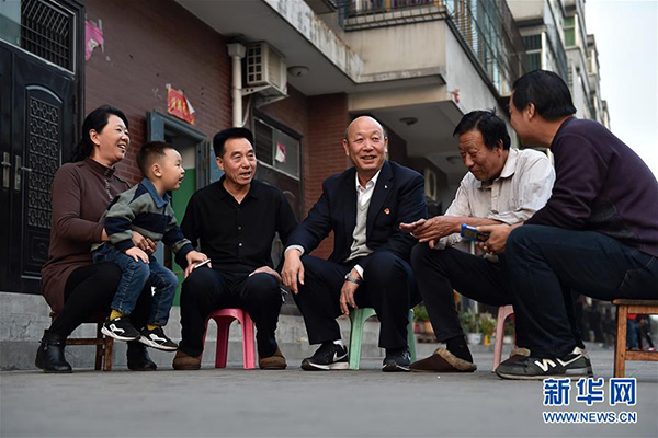 11月8日,在山西省河津市清澗街道辦龍門村,原貴生(右三)和村民聊天。新華社記者 詹彥 攝
