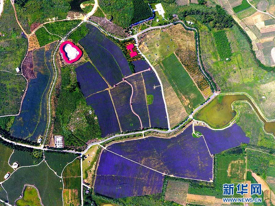 這是5月26日航拍的廣西忻城縣薰衣草莊園。通過農業、文化、旅游的深度融合,從農業供給側改革上精準發力,忻城走出了一條以農業產業創新帶動第三產業發展的道路。新華社記者 黃孝邦 攝