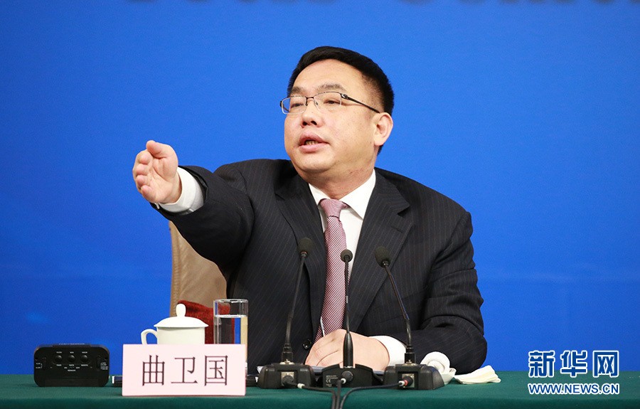 3月11日,十二屆全國人大五次會議新聞中心舉行記者會,邀請國家衛生計生委主任李斌、副主任王培安和副主任、國務院醫改辦主任王賀勝就“‘十三五’開局之年衛生計生改革發展”的相關問題回答中外記者的提問。圖為記者會主持人曲衛國。新華網/中國政府網?翟子赫 攝?