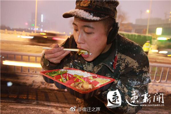 官兵們?cè)诒┭┲芯o急就餐