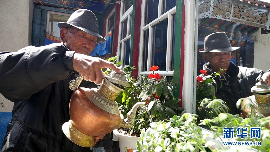 索朗頓珠在家中給花澆水(3月20日攝)。 新華社記者余剛攝