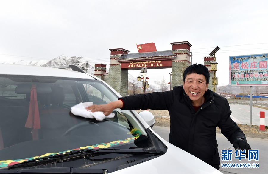 3月27日,克松村致富能手達瓦準備開車出行。 新華社記者覺果攝