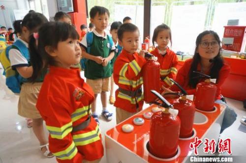 資料圖:兒童節(jié)孩子們穿上迷你消防服,體驗(yàn)?zāi)M滅火。 韓章云 攝