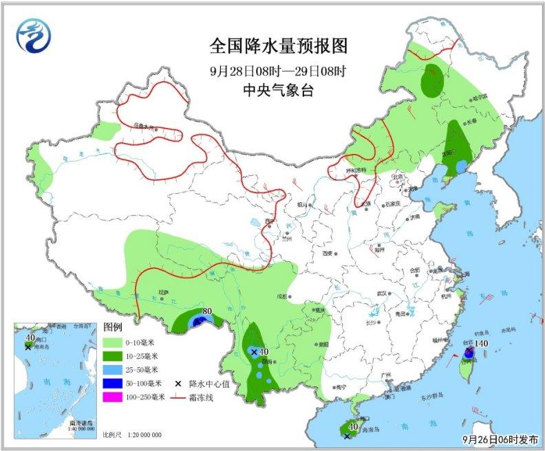 9月28日08時至29日08時,內蒙古中東部、東北地區中南部、西南地區西南部和海南島大部以及西藏中東部等地的部分地區有中到大雨,局地有暴雨或大暴雨(50~140毫米)(見圖3)。東海大部海域、臺灣海峽、臺灣以東洋面、南海東北部海域、巴士海峽將有7~8級、陣風9~10級大風,其中東海東南部海域、臺灣以東洋面的部分海域風力可達9~11級、陣風12~13級。