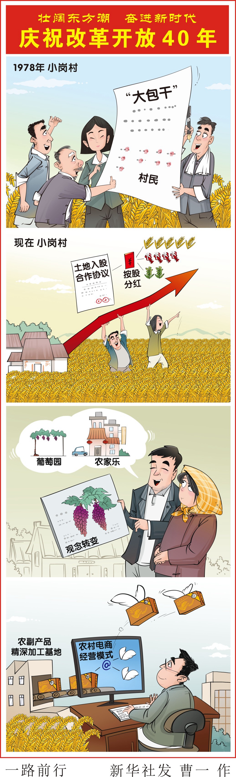 1978年的小崗村,18位村民按下了分田到戶的紅手印,“大包干”拉開了中國(guó)農(nóng)村改革的大幕。40年后的小崗村,正在開展農(nóng)村集體產(chǎn)權(quán)制度改革,土地入股讓農(nóng)民變股東;葡萄園里開起了農(nóng)家樂,對(duì)農(nóng)副產(chǎn)品進(jìn)行精深加工,電商經(jīng)營(yíng)模式助力產(chǎn)品打開銷路,觀念的轉(zhuǎn)變讓小崗村里的農(nóng)民不再僅僅種著一畝三分地。