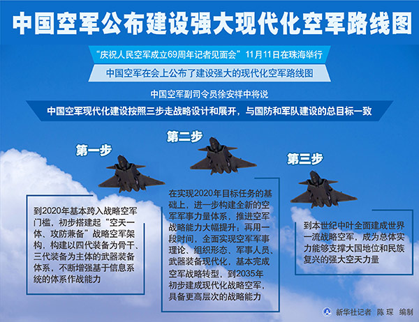 新華社廣州11月11日電(記者黃書波、于曉泉)“慶祝人民空軍成立69周年記者見面會”11日在珠海舉行,中國空軍在會上公布了建設(shè)強大的現(xiàn)代化空軍路線圖。