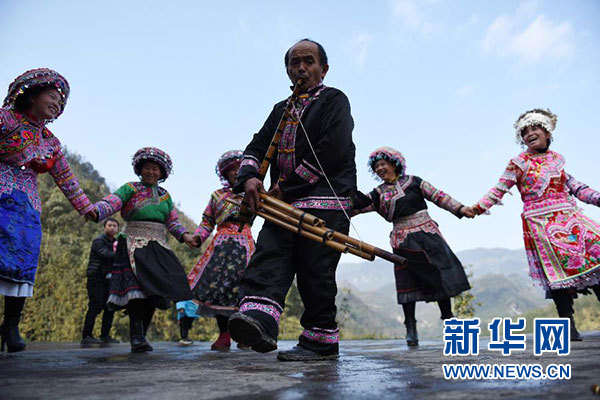 四川省敘永縣后山鎮三斗米村苗族村民與游客一起跳蘆笙舞(1月16日攝)。新華社記者 陳天湖 攝