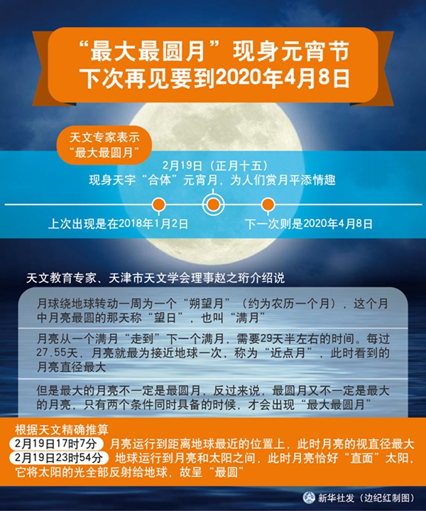 新華社天津2月19日電(記者周潤健)年度“最大最圓月”19日(正月十五)現身天宇“合體”元宵月,為人們賞月平添情趣。天文專家表示,“最大最圓月”上次出現是在2018年1月2日,下一次則是2020年4月8日。