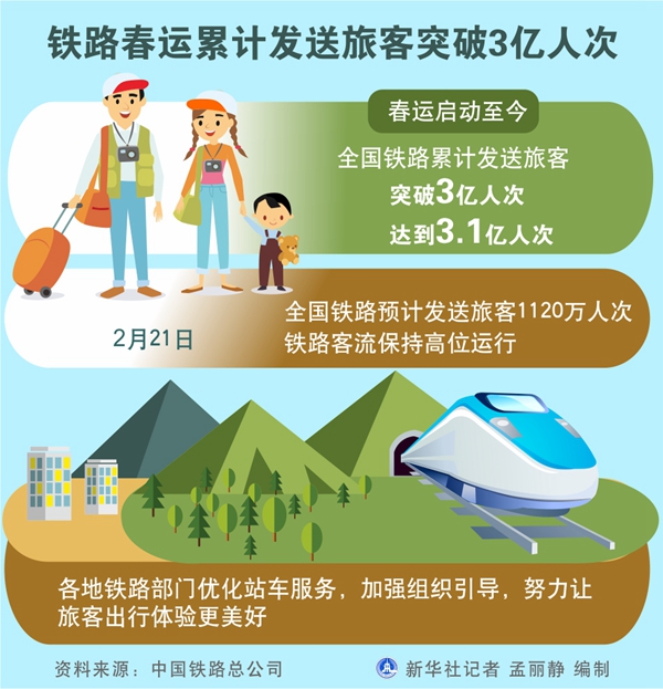新華社北京2月21日電(記者樊曦)記者從中國鐵路總公司獲悉,春運(yùn)啟動至今,全國鐵路累計(jì)發(fā)送旅客突破3億人次,達(dá)到3.1億人次。