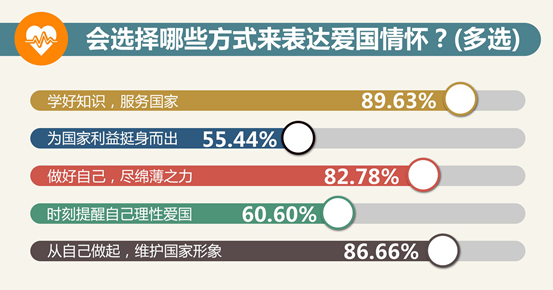 大學(xué)生表達(dá)愛國的方式更加務(wù)實,94.03%的受訪者認(rèn)為“理性愛國是最好的方式”。超過80%的大學(xué)生認(rèn)為愛國要先從自己做起,“學(xué)好知識、服務(wù)國家”“做好自己,為社會盡綿薄之力”等成為很多大學(xué)生的首選。陜西師范大學(xué)學(xué)生強德平說,愛國有三點,第一是銘記歷史,第二是展望未來,第三是把握當(dāng)下。中國人民大學(xué)學(xué)生張嘯寒說,走到人民生產(chǎn)實踐的第一線,是關(guān)心國家和社會的最好方式。