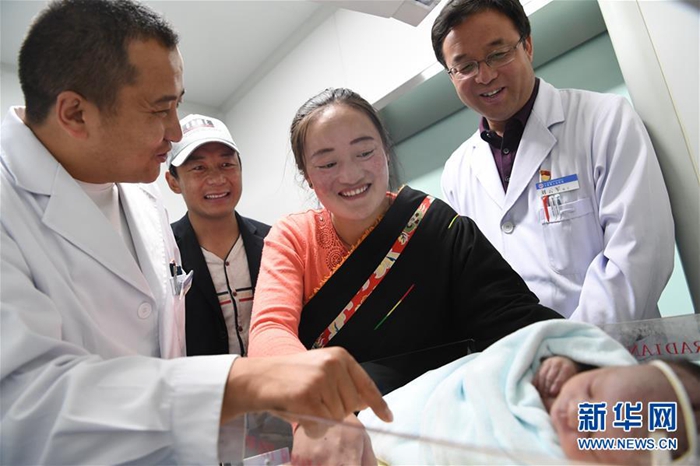 這是來自北京的援青干部劉云軍(右一)看望新生兒(資料照片)。新華社發