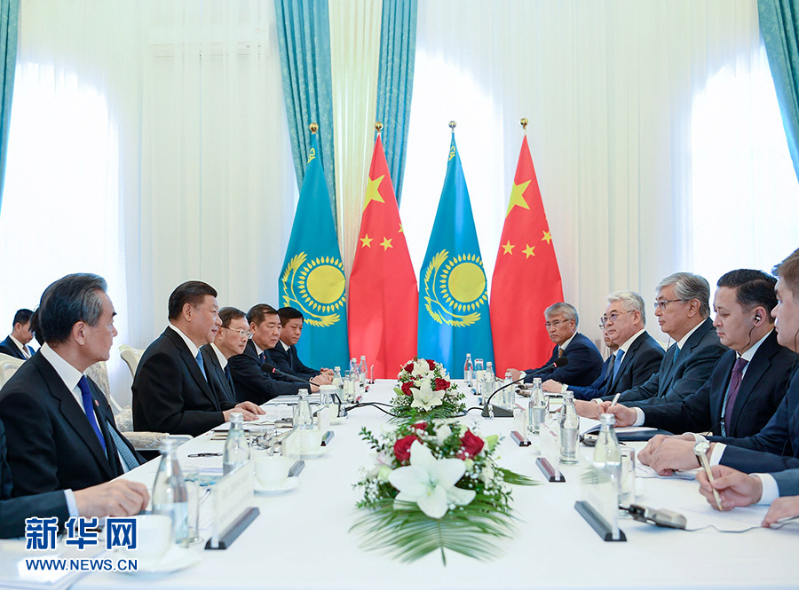 6月13日,國家主席習近平在比什凱克會見哈薩克斯坦總統托卡耶夫。 新華社記者 高潔 攝