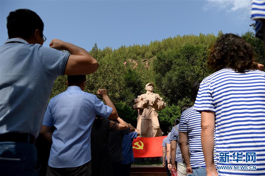 參觀者在陜西延安棗園革命舊址張思德雕像前重溫入黨誓詞(8月1日攝)。新華社記者 劉瀟 攝