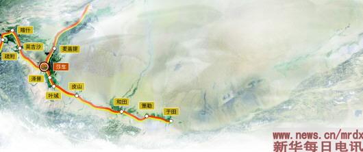 打開地圖,沿著古絲綢之路一路向西,在敦煌分了一個岔,一路向北的叫北線,一路向南的叫南線,中間隔著塔克拉瑪干大沙漠。南線沿著沙漠邊緣,在昆侖山脈水系的滋潤下,出現一串珍珠似的綠洲:樓蘭、于田、莎車……