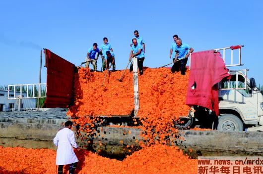2019年7月,工人們將整車的萬壽菊卸下來,放進晨光生物莎車公司的青儲池進行發酵,再進行烘干、造粒、萃取后得到葉黃素浸膏,加工成葉黃素晶體,遠銷海外。