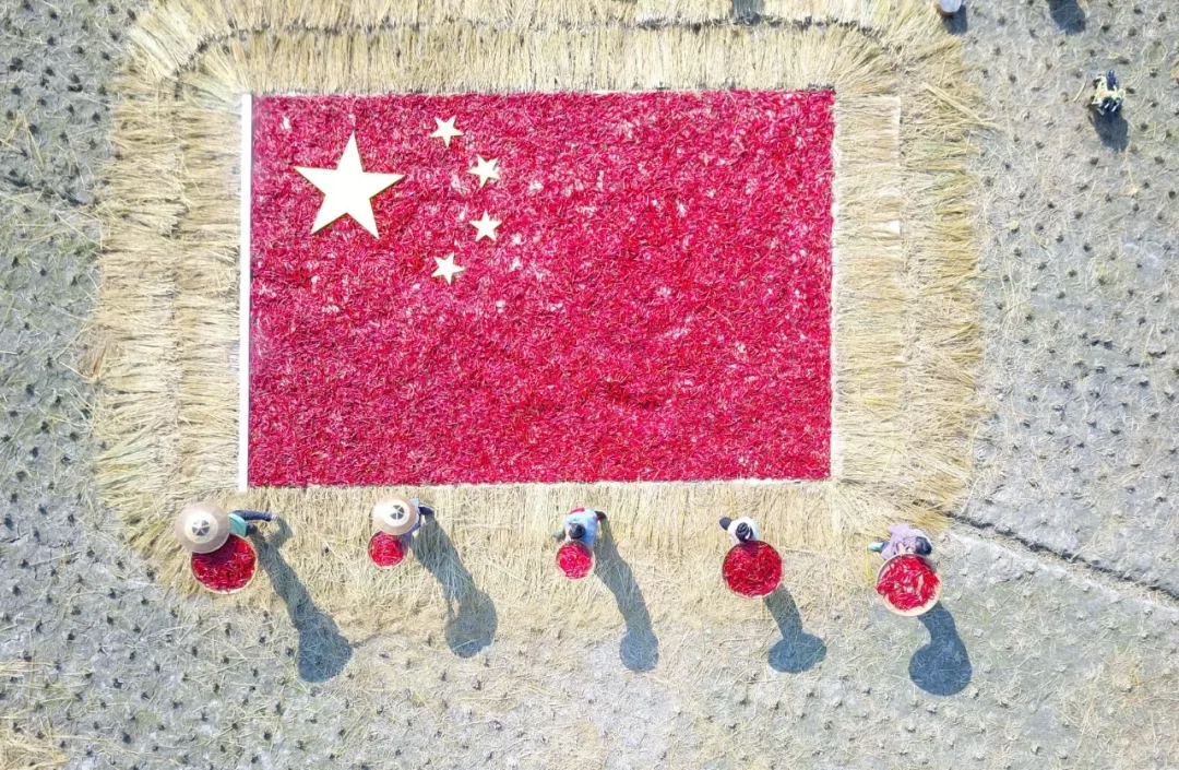 2019年9月30日,貴州凱里。舟溪鎮曼洞村的村民用辣椒拼出國旗圖案,以樸實的方式表達對祖國的熱愛和美好祝福。作者:紫氣東來