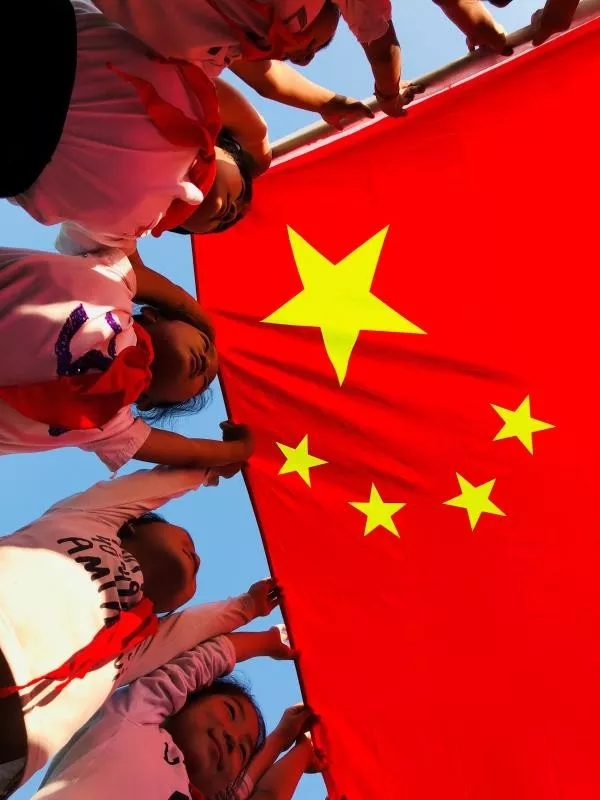 2019年9月28日,甘肅甘谷。幼兒園的小朋友歡快地揮動手中的五星紅旗,祝福祖國生日快樂!作者:草野沐風