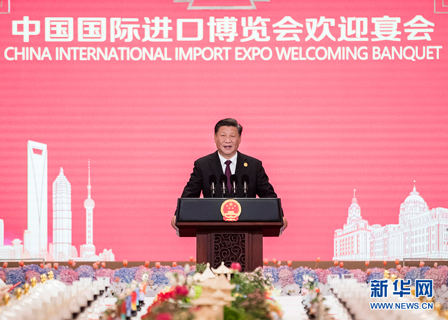 11月4日晚,國家主席習近平和夫人彭麗媛在上海和平飯店舉行宴會,歡迎出席第二屆中國國際進口博覽會的各國貴賓。這是習近平發表致辭。 新華社記者 王曄 攝