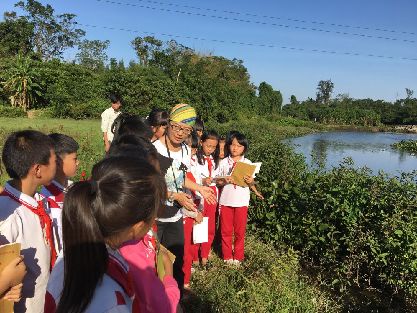 ??谒墒髮W堂創始人高高老師在給海口瓊山十二小的學生講解濕地生物的特點