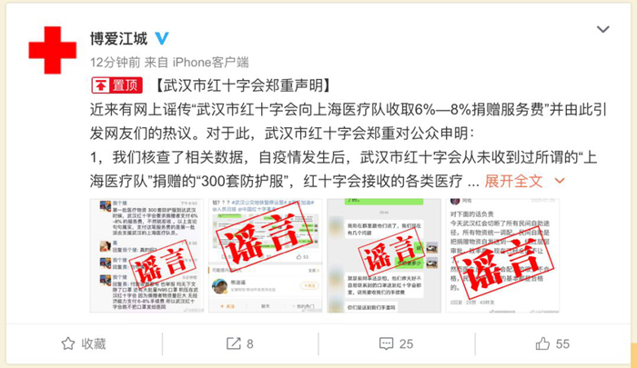 武漢市紅十字會呼吁廣大網友,不要讓謠言玷污了各界愛心企業和愛心人士的善意之舉,疫情面前,不信謠、不傳謠,眾志成城,共渡難關。