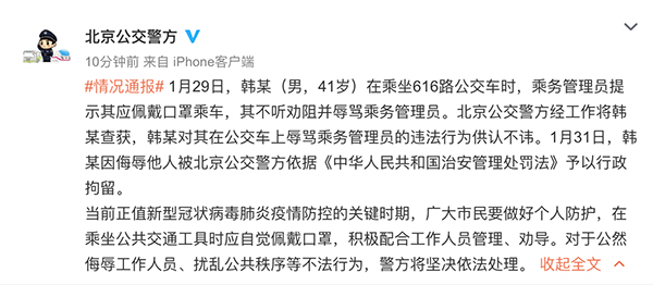 據@北京公交警方剛剛發(fā)布的消息,1月29日,韓某(男,41歲)在乘坐616路公交車時,乘務管理員提示其應佩戴口罩乘車,其不聽勸阻并辱罵乘務管理員。北京公交警方經工作將韓某查獲,韓某對其在公交車上辱罵乘務管理員的違法行為供認不諱。