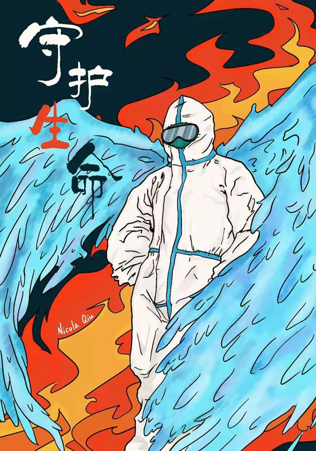 來自家人的牽掛總是最暖心,世紀壇醫院領隊丁新民收到了女兒自己畫的一幅畫,畫的正中央寫著眾志成城: