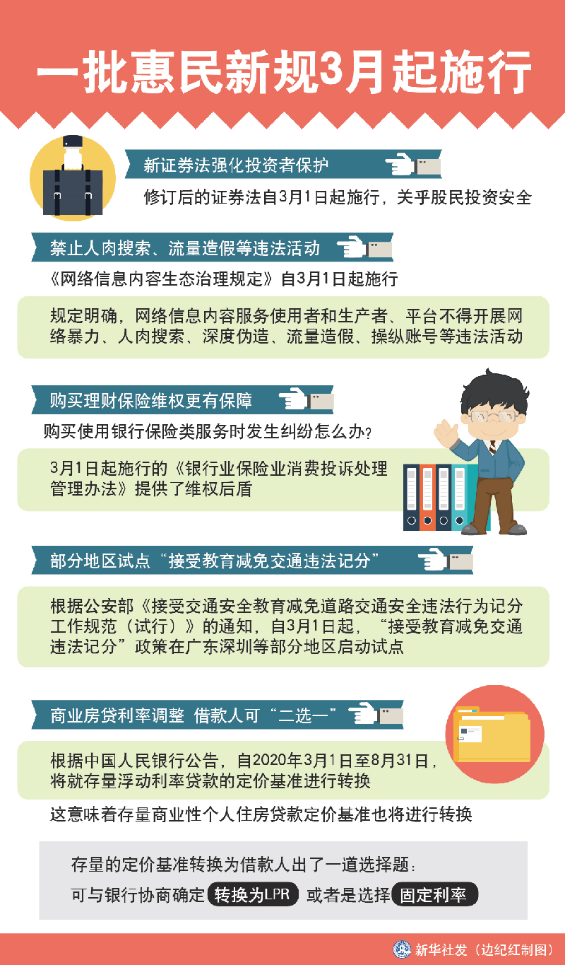 更完善的證券法保障股民權益、更細致的網絡治理新規禁止“人肉搜索”等行為、更靈活的房貸利率給民實惠、更貼心的交管新規啟動試點……3月起,一批惠民新規開始實行,關乎你我切身利益。