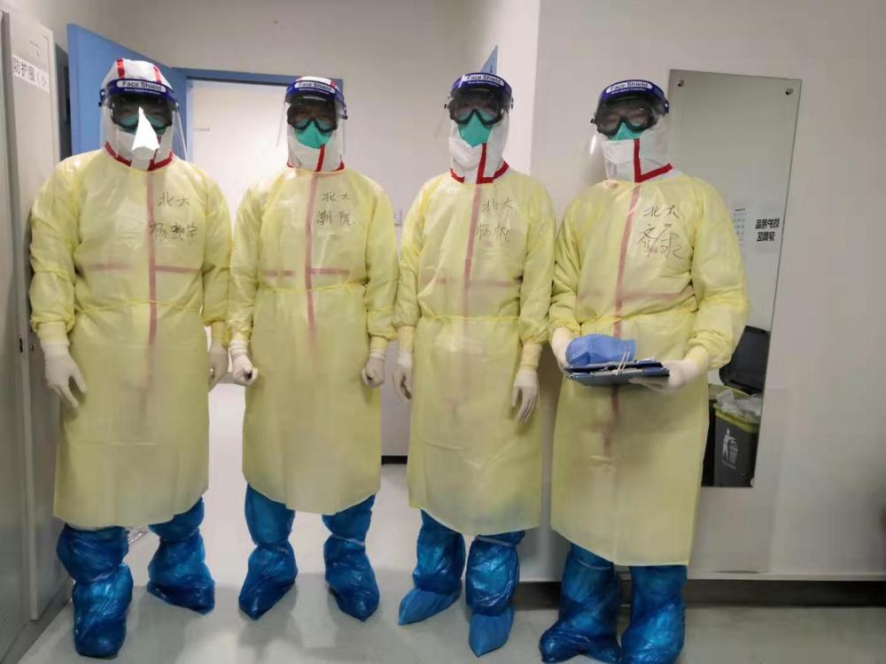 圖為北京大學第一醫院援湖北醫療隊李海潮與同事在武漢工作中合影。