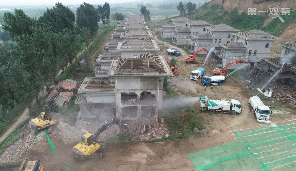 2018年8月14日,大型機械對西安市鄠邑區蔣村鎮的違建別墅進行拆除。(新華社記者 邵瑞 攝)