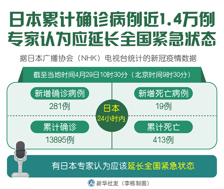 新華社東京4月29日電(記者華義)據(jù)日本廣播協(xié)會(huì)(NHK)電視臺(tái)統(tǒng)計(jì)的新冠疫情數(shù)據(jù),截至29日10時(shí)30分(北京時(shí)間9時(shí)30分),日本24小時(shí)內(nèi)新增確診病例281例,累計(jì)確診13895例;新增死亡病例19例,累計(jì)死亡413例。有日本專(zhuān)家認(rèn)為應(yīng)該延長(zhǎng)全國(guó)緊急狀態(tài)。