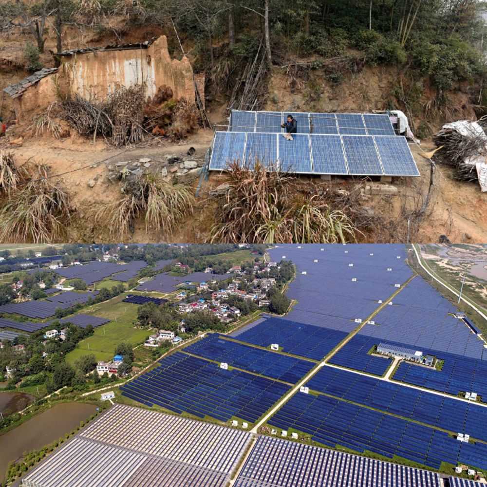 (上圖:2015年1月28日,金寨縣全軍鄉沙河店村村民在擦拭自家后院的光伏發電板,新華社記者劉軍喜攝;下圖:2017年9月14日,金寨縣小南京光伏農業生態園全景。新華社記者陶明攝)