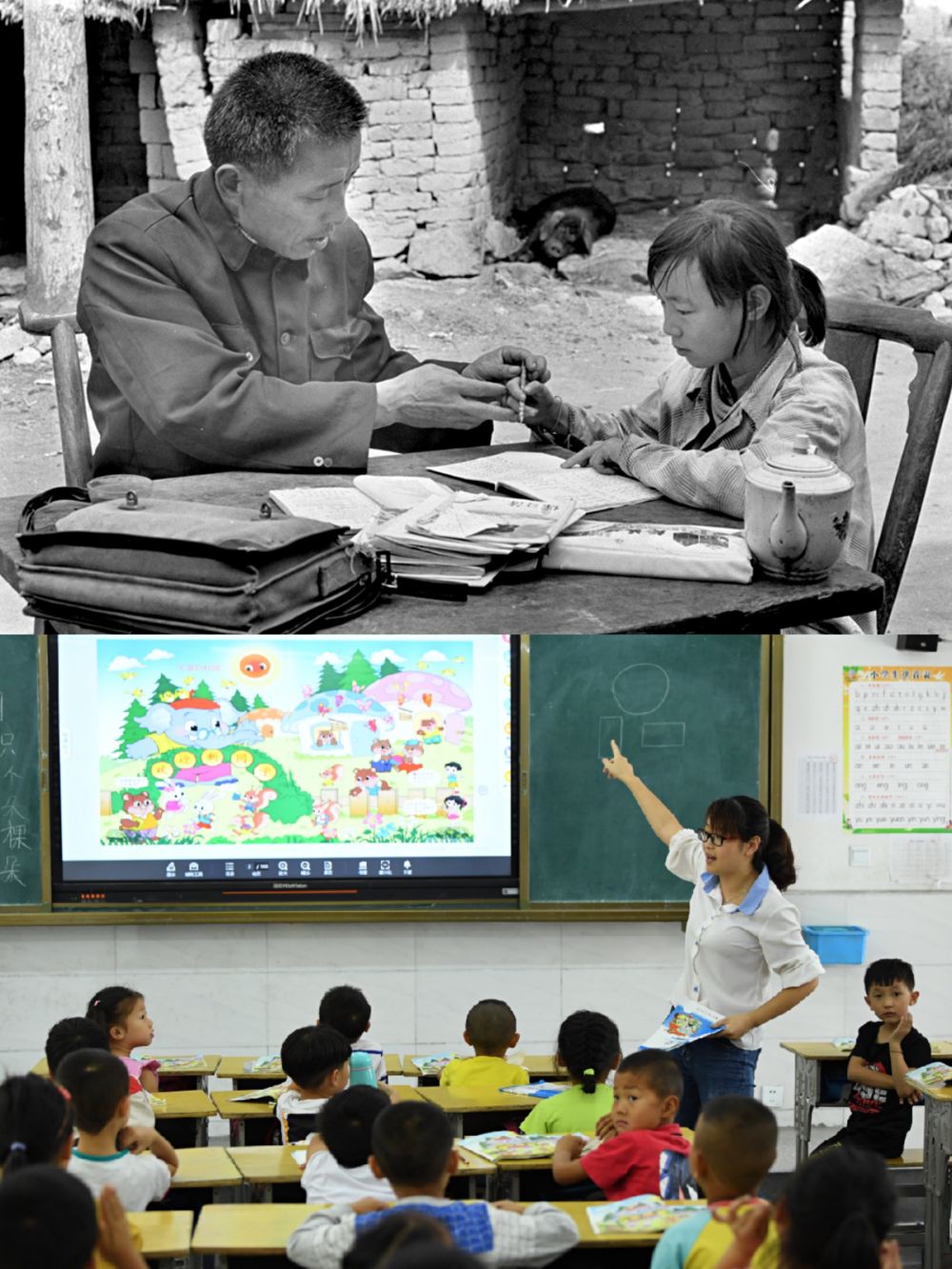 (上圖:1991年5月,金寨縣希望小學老師胡遵訓跑20多里山路為學生胡亞麗補課,新華社記者張曙光攝;下圖:2019年9月3日,金寨縣希望小學南校區學生通過多媒體上課。新華社記者劉軍喜攝)