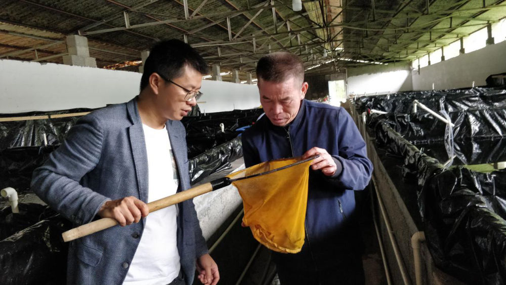 廣西上林縣西燕鎮岜獨村駐村第一書記康勇(左一)在龜鱉養殖場和養殖能人交流(4月24日攝)。新華社記者 農冠斌 攝