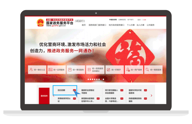 你可以通過(guò)電腦使用網(wǎng)頁(yè)搜索找到“國(guó)家政務(wù)服務(wù)平臺(tái)”后,首頁(yè)點(diǎn)擊“百日招聘”進(jìn)入訪問(wèn),也可以點(diǎn)擊下方圖片直達(dá)“百日招聘”專題。