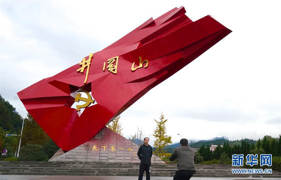 游客在井岡山的“井岡紅旗”雕塑前參觀留影(2018年11月21日攝)。 新華社記者 胡晨歡 攝