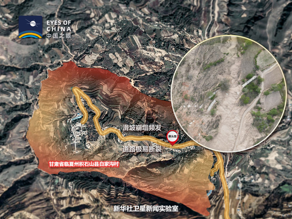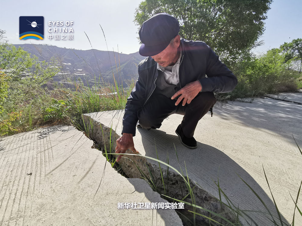 白家溝村地處濕陷性黃土滑坡帶。從衛(wèi)星看,整個村子山峰陡峭,基巖裸露,難以找到一塊成片的平地。人只能見縫插針式地居住在疏松、干裂的黃土地上。一條崎嶇的路像絲帶一樣“搭”在懸崖峭壁上,隨時有掉下來的危險。