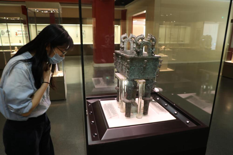 “造型雄偉,工藝精湛,鼎口雙耳上浮雕雙獸,腹部四面用圓雕、浮雕技法,分別飾有垂葉紋和饕餮紋,四角扉棱突起,別具風格,最有趣的是鼎的柱足也裝飾有扉棱,并在中間裝飾有圓盤,這在商周青銅器中是獨一無二的。”陳卓說。