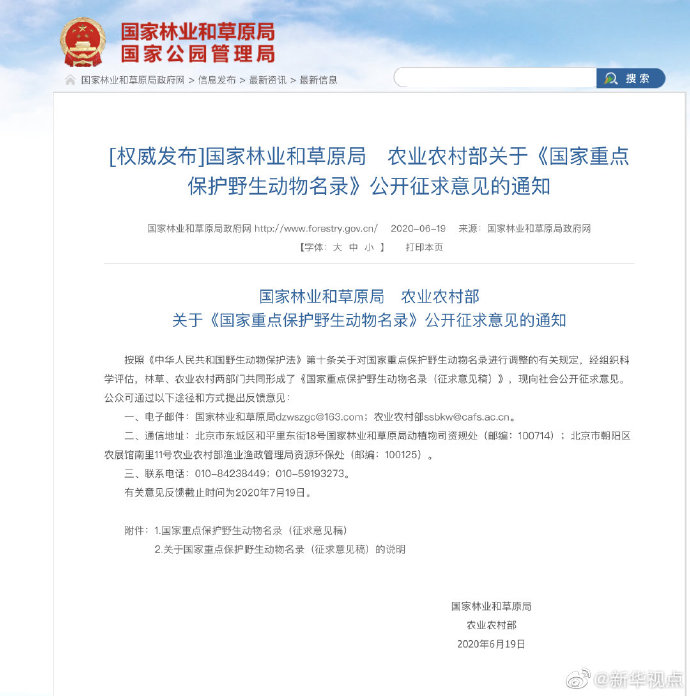 這些調整你同意嗎?公眾可通過以下途徑和方式提出反饋意見:一、電子郵件:國家林業和草原局dzwszgc@163.com;農業農村部ssbkw@cafs.ac.cn。二、通信地址:北京市東城區和平里東街18號國家林業和草原局動植物司資規處(郵編:100714);北京市朝陽區農展館南里11號農業農村部漁業漁政管理局資源環保處(郵編:100125)。三、聯系電話:010-84238449;010-59193273。有關意見反饋截止時間為2020年7月19日。(記者胡璐)