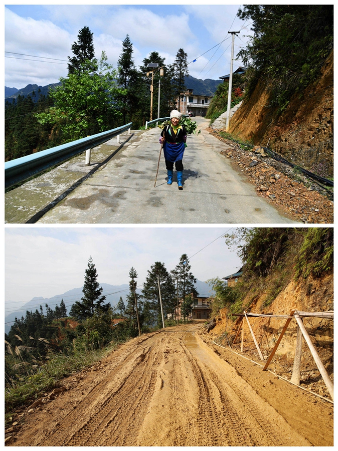 拼版照片的上圖為2020年3月31日,下地勞作歸來的村民走在貴州省從江縣加勉鄉真由村新修的通村公路上(新華社記者 楊文斌 攝);下圖為2016年12月3日拍攝的從江縣加勉鄉真由村的通村道路(貴州橋梁集團供圖)。新華社發