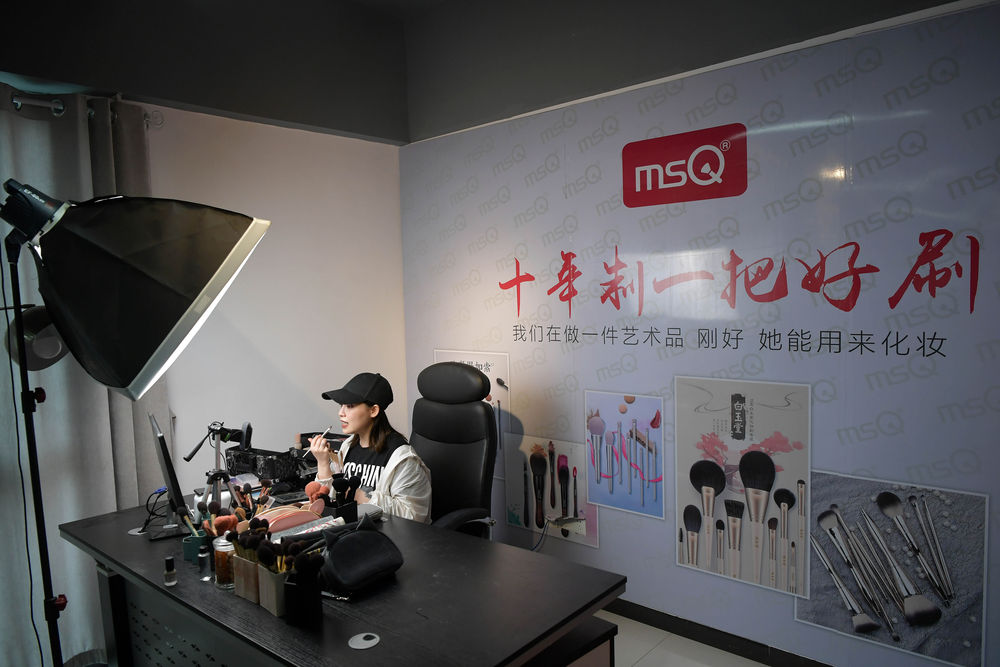5月15日,在江西省南昌市青山湖區一家電商企業的直播間內,主播線上直播銷售化妝刷。新華社記者 彭昭之 攝