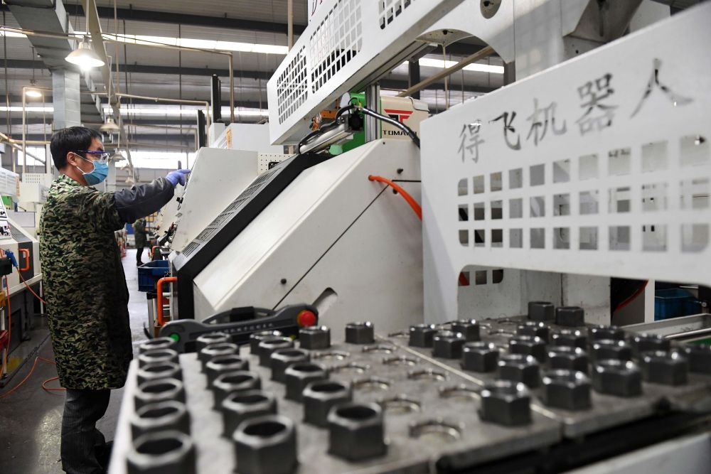3月5日,在江西省宜春市一家企業車間內,工人在半自動化生產線上工作。各地工業企業在做好疫情防控的同時積極復工復產。新華社發(周亮 攝)