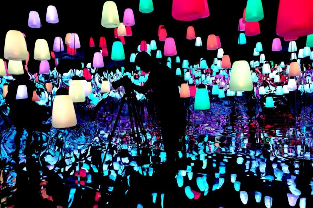 6月19日晚,一名攝影者在上海青衫夜市的燈光全息互動展上拍攝