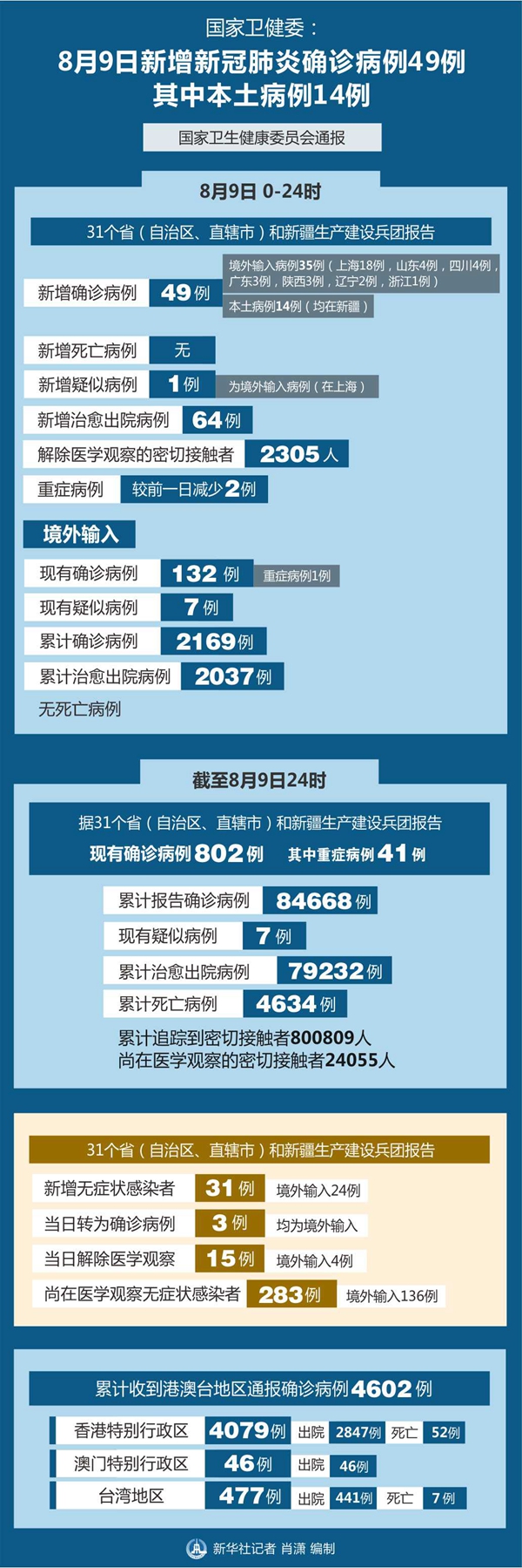 新華社北京8月10日電 國家衛生健康委員會10日通報,8月9日0-24時,31個?。ㄗ灾螀^、直轄市)和新疆生產建設兵團報告新增新冠肺炎確診病例49例,其中境外輸入病例35例(上海18例,山東4例,四川4例,廣東3例,陜西3例,遼寧2例,浙江1例),本土病例14例(均在新疆);無新增死亡病例;新增疑似病例1例,為境外輸入病例(在上海)。