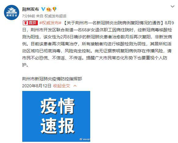 據(jù)湖北省荊州市新冠肺炎疫情防控指揮部12日通報(bào),8月9日,荊州市開發(fā)區(qū)聯(lián)合街道一名68歲女退休職工因病住院時(shí),經(jīng)新冠病毒核酸檢測為陽性,該女性為2月8日確診的新冠肺炎患者治愈數(shù)月后再次復(fù)陽,非新發(fā)病例。目前該患者再次隔離治療,所有接觸者均進(jìn)行核酸檢測為陰性,其居所和活動區(qū)域均已徹底消毒,風(fēng)險(xiǎn)完全控制。尚無證據(jù)表明復(fù)陽病例存在傳播風(fēng)險(xiǎn),請市民不必恐慌、不信謠、不傳謠。提醒廣大市民常態(tài)化形勢下也要重視個(gè)人防護(hù)。