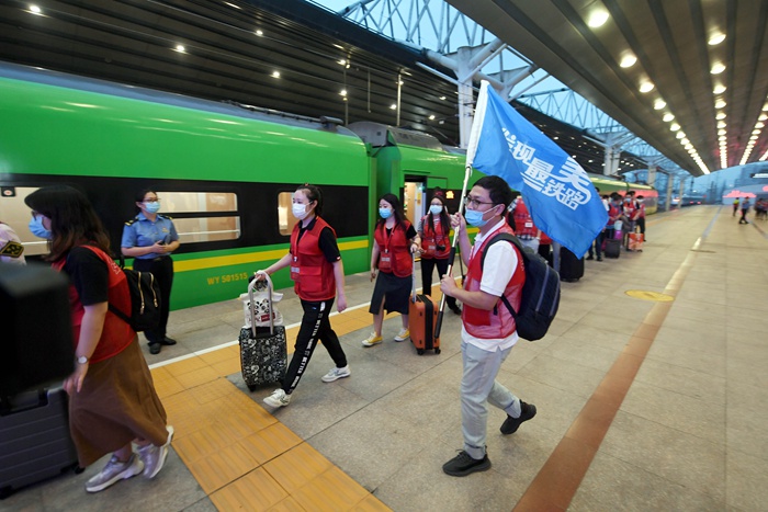 8月16日,參加2020年“發(fā)現(xiàn)最美鐵路”網(wǎng)宣活動的媒體記者乘坐列車出發(fā)。(中國國家鐵路集團有限公司供圖 楊寶森攝)